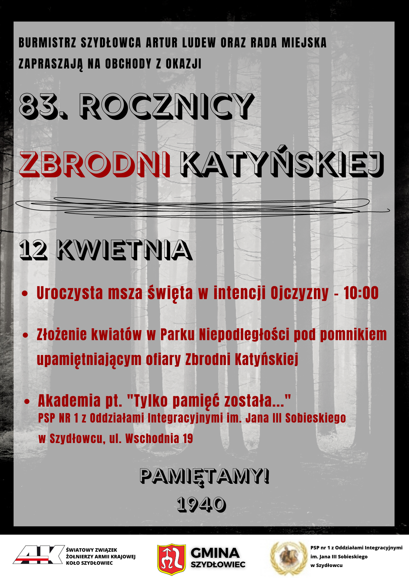 Obchody rozpoczniemy od mszy świętej w kościele parafialnym św. Zygmunta w Szydłowcu, o godzinie 10:00. Podczas eucharystii będziemy modlić się za ofiary Zbrodni Katyńskiej w 83. rocznicę tego wydarzenia oraz w intencji Ojczyzny.