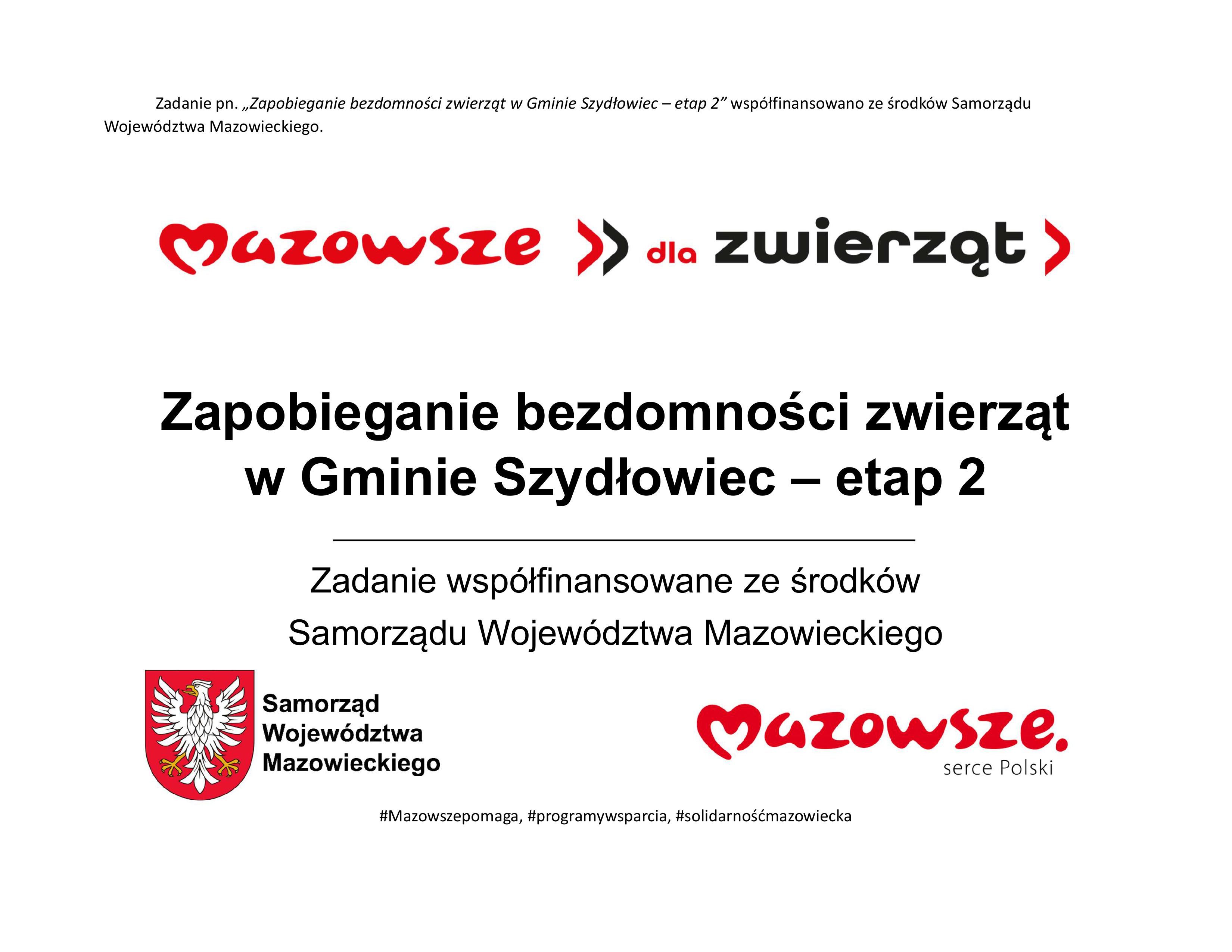 Zadanie pn. „Zapobieganie bezdomności zwierząt w Gminie Szydłowiec – etap 2” współfinansowano ze środków Samorządu Województwa Mazowieckiego.