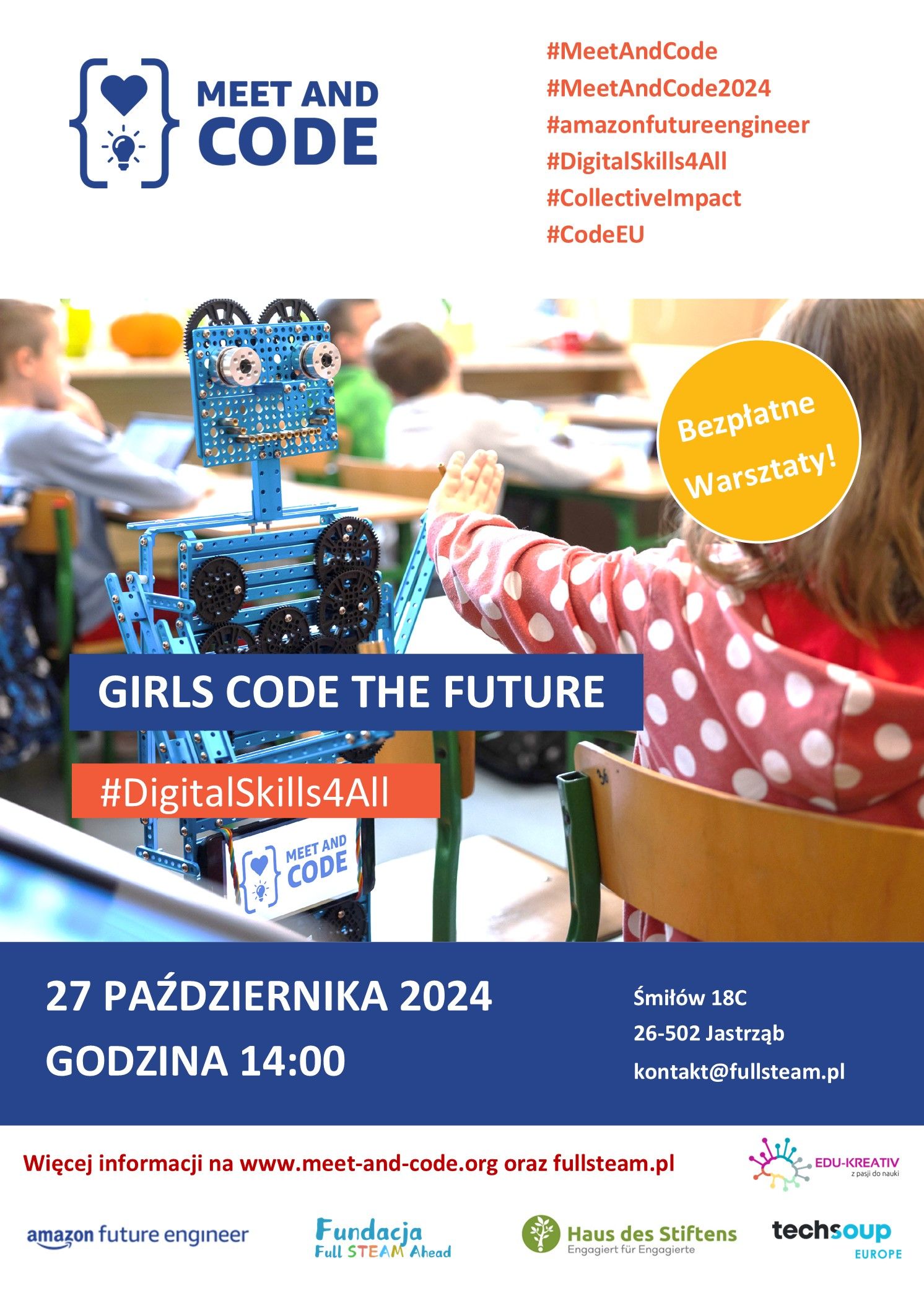 Dzięki dofinansowaniu otrzymanemu w ramach inicjatywy Meet and Code, Fundacja Full STEAM Ahead razem z EDU KREATIV zorganizuje całkowicie darmowy warsztat programistyczny dla dziewcząt w wieku 8-14 lat z terenu powiatu szydłowieckiego "Girls code the future".