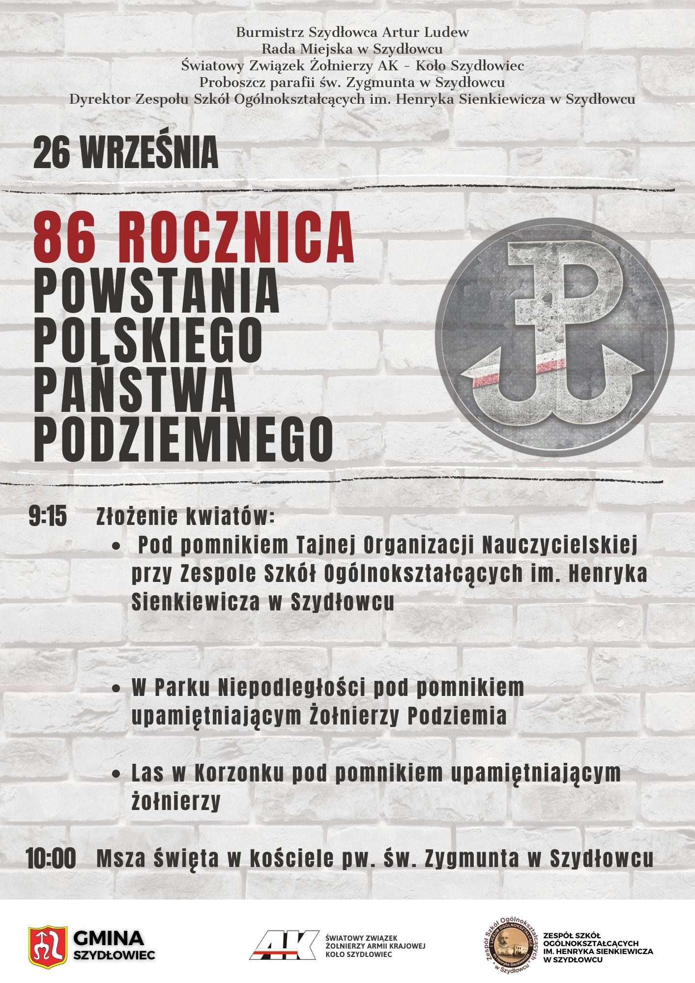 Burmistrz Szydłowca Artur Ludew, Rada Miejska w Szydłowcu, Światowy Związek Żołnierzy AK - Koło Szydłowiec, Proboszcz Parafii pw. św. Zygmunta w Szydłowcu, Dyrektor Zespołu Szkół Ogólnokształcących im. H. Sienkiewicza w Szydłowcu serdecznie zapraszają 26 września br. do wspólnego uczczenia 86. rocznicy Powstania Polskiego Państwa Podziemnego.